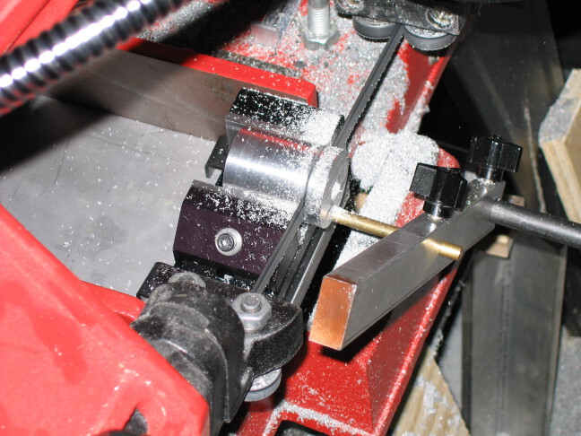 This is a closeup of the Sherline Vise being used to hold material being cut. You can also see the quick and dirty work stop that I created. The work stop that came with the bandsaw won't reach work in the vise.