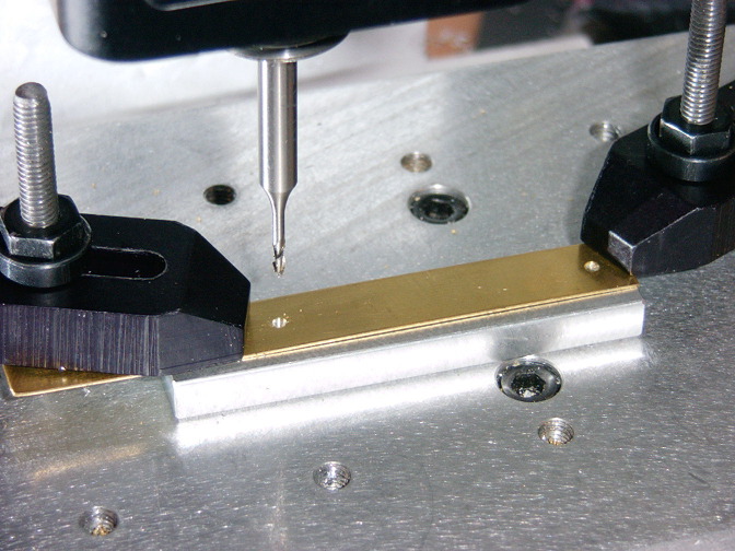 I drilled the holes, one at each end of the slot, and one at the end (underneath the clamp on the left). I used an end mill and plunged the holes since I was going to mill the slot anyways.