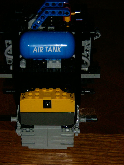 Here we can see the air tank and the 9v battery holder which is used to provide power to the pump. The pump is completely isolated electronically from the RCX, and keeps the air tank pressurized all by itself.